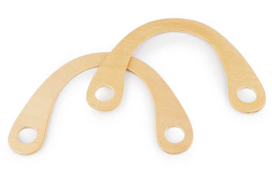 A fa fülek átmérője 15×22 cm, vastagsága 4 mm, mindkét végén kerek kivágások vannak, melyek átmérője 3 cm, ezekbe fogatjuk az anyagot. Ezzel a darabbal sok érdekes táskát lehet készíteni. Külső kerülete 40 cm.